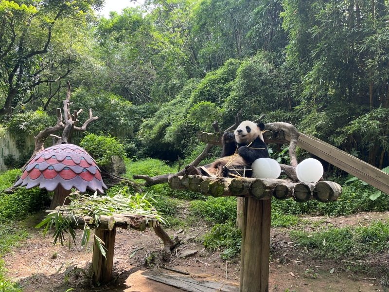 拍摄内容:动物园中,大熊猫正津津有味的啃吃竹子,憨态可掬,引游客纷纷驻足观看。
