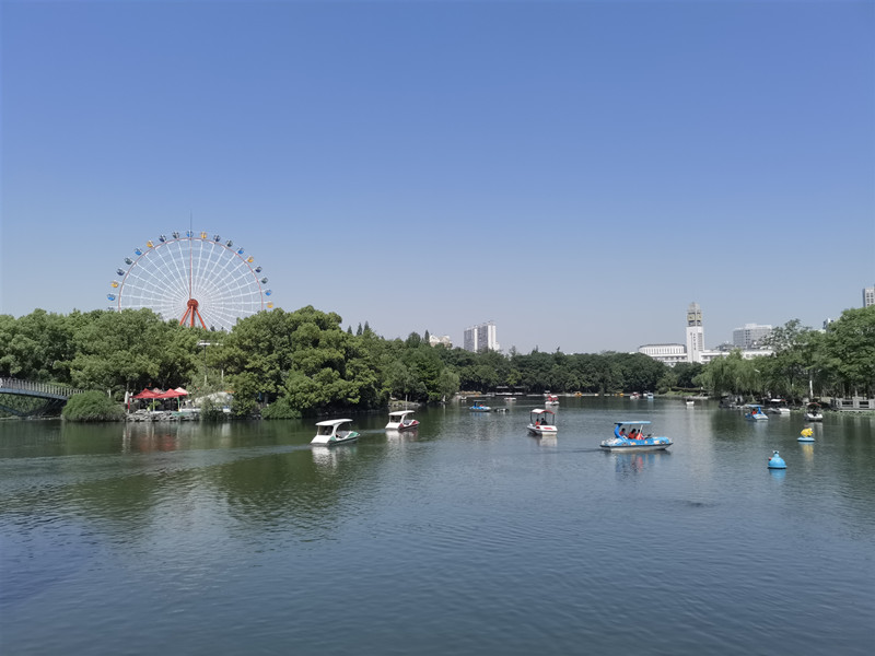 拍摄内容:天气晴朗,万里无云。近处,湖面上波光粼粼,闪耀着人们的眼睛,游人们踏着小船儿,悠闲自得。远处,摩天轮里谈笑风生,欣赏着合肥老城,回想起无数美好记忆。万物可爱,未来可期。
