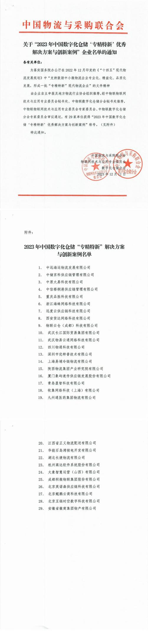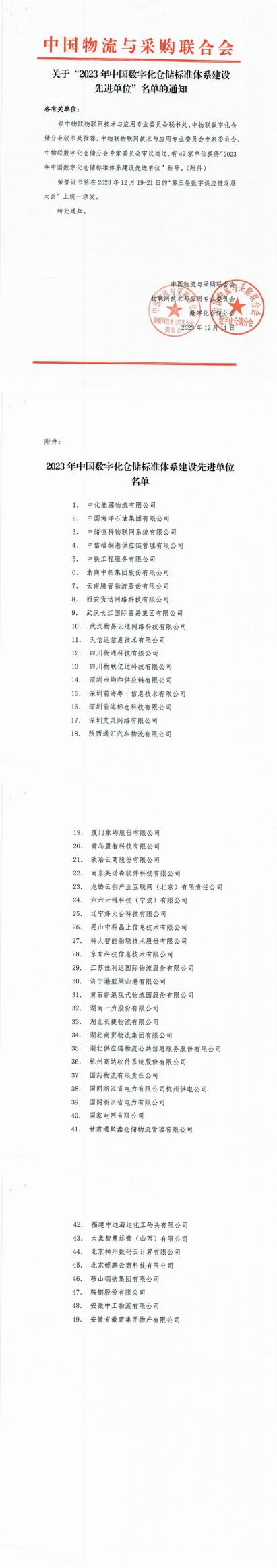 2023年12月11日,经中物联物联网技术与应用专业委员会专家委员会、中物联数字化仓储分会专家委员会审议通过,安徽省徽商集团物产有限公司荣获“2023年中国数字化仓储标准体系建设先进单位”、“2023年中国数字化仓储‘专精特新’优秀解决方案与创新案例”称号。徽商物产合肥港物流基地自2021年建成运营以来,充分借助信息化建设,并利用移动互联网、物联网、可视化技术等新一代信息技术,不断打造成为合肥地区最具现代化水平、科技含量高、绿色智慧化的临港物流园区。这是徽商物产合肥港物流基地继入选“中物联全国数字化仓库企业试点(第六批)”后再次获得两项殊荣,也是安徽省唯一一家连续获奖企业。