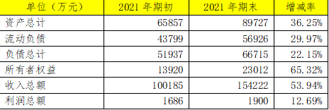 2021年度本公司资产总计89,726万元;负债总计66,714万元;所有者权益总计23,012万元。同比分别增长36.24%、28.45%、65.31%。