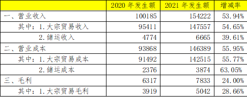 物产公司2021年全年销售钢材、水泥等商品53.08万吨,同比增长34.43%。全年销售收入154222万元,增长53.89%。2021年实现利润总额1900万元,完成公司下达年度利润指标的160.77%。。