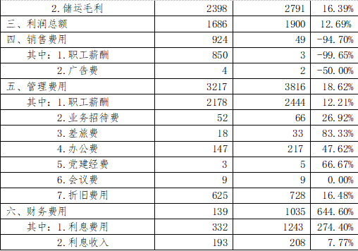 三项费用合计4900万元,较上年同期增加620万元,增长14.48%。主要一是销售费用减少支出875万元,主要是根据审计调整,将销售费用薪酬调整至主营业务成本,较上年减少847万元;二是管理费增加599万元,其中薪酬支出增加266万元;合肥港资产入账,使得折旧费增加103万元;经营业务的增加,招待费、差旅费增加29万元;21年开始实行新的费用管理办法,办公费、通讯费增加支出70万元,三是财务费用今年列支1035万元,而去年同期财务费用是139万元,增加支出896万元,主要是利息支出和手续费因项目承兑贴现以及保理费用支出导致多支出911万元,利息收入减少15万元。