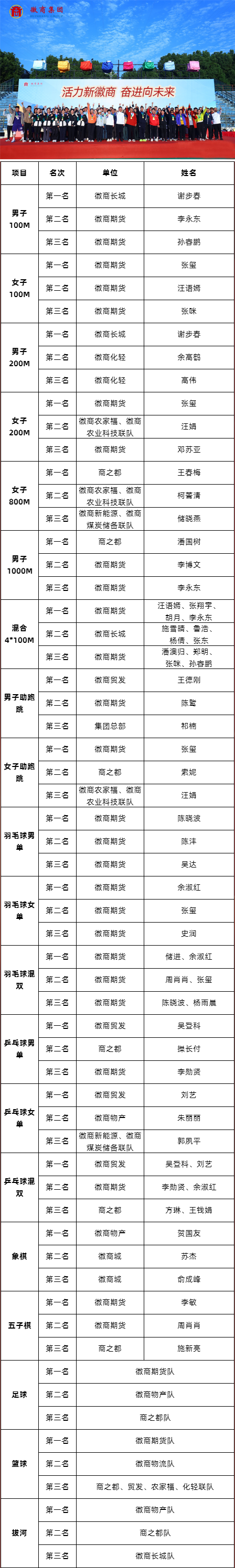 2024年10月25日,集团举办首届职工运动会,共设置田径类、球类、棋类、趣味类4种比赛项目,来自集团总部和各直属(控股)公司的12支代表队近350名运动员参加比赛。现将各项目前三名名单公布如下。