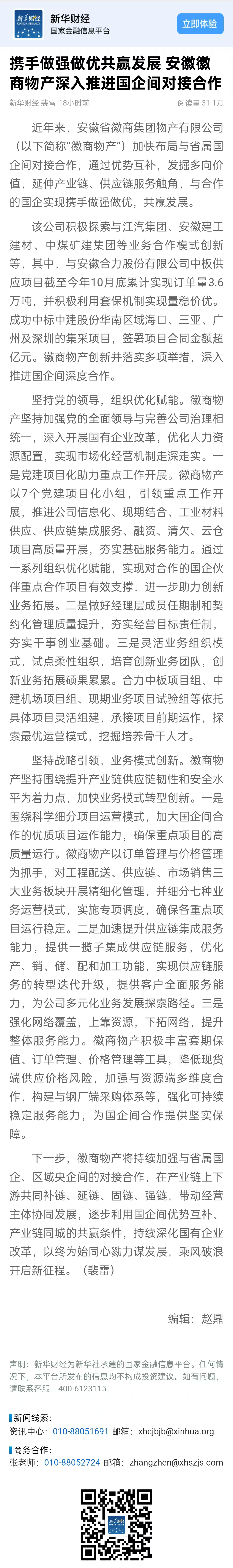 新华财经关注报道:携手做强做优共赢发展 安徽徽商物产深入推进国企间对接合作