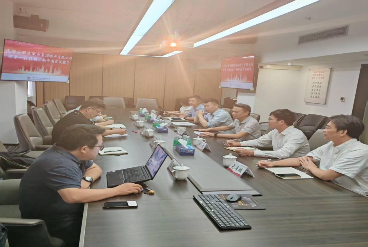 2025年7月22日下午,徽商物产党委副书记、总经理程衎一行到访广东广物中南公司,与该公司党委副书记、总经理艾兵举行座谈。徽商物产运营总监王伟、现期结合运营部负责人王增益等陪同参与。广东广物中南公司党委委员、副总经理朱毅强及相关部门负责人出席座谈。