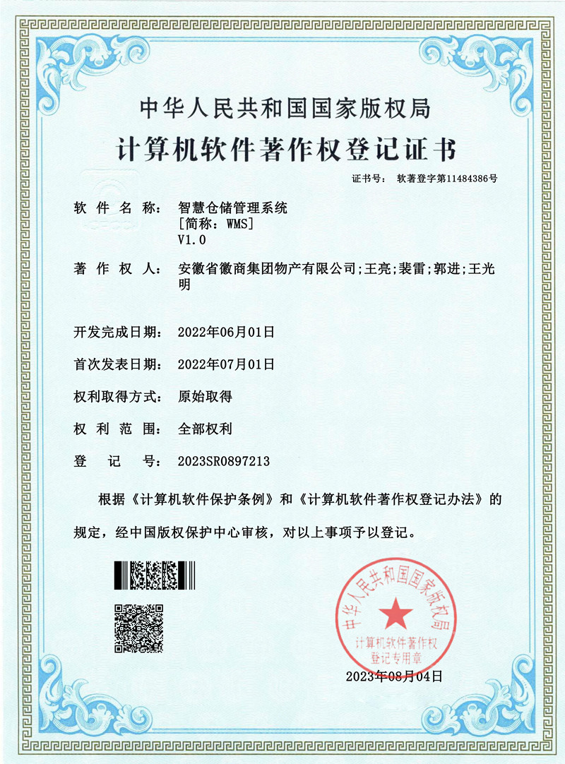 徽商物产WMS智慧仓储管理系统获得国家计算机软件著作权专利